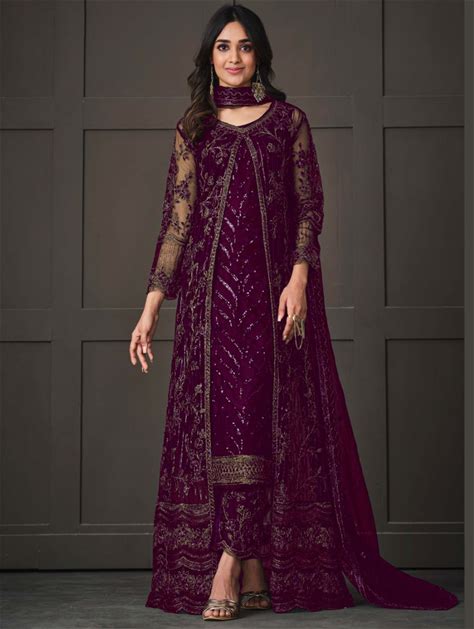 Wine Net Wedding Indian Pakistani Long Gown Anarkali Suit Semi Stitched - Anarkali-Salwar-Kameez