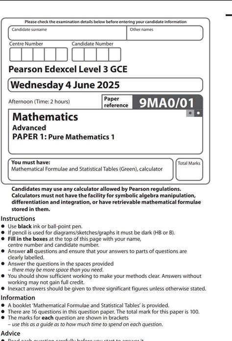 2025 Pearson Edexcel A Level Mathematics Paper 01 + Mark Scheme 9Fm0 01